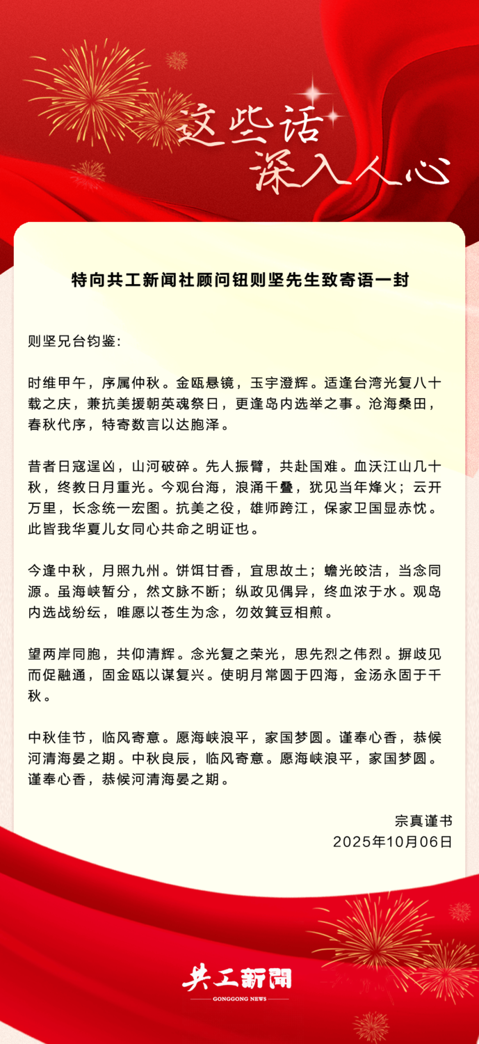 发表时间:2025-10-06 20:40来源:共工新闻社 共工新闻社10月6日电(张宗真) 时值台湾光复八十周年、抗美援朝英魂祭日,又逢中秋佳节,全国政协常委张宗真心系两岸,同怀民族复兴伟业,特向共工新闻社顾问钮则坚先生致寄语一封,情真意切,文采斐然,寄托两岸同胞共盼统一、共圆家国梦的深厚情怀。