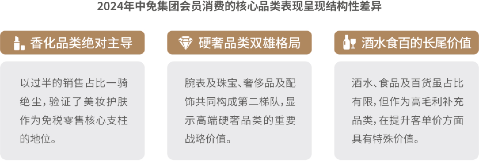 图源:《2024-2025中免消费白皮书》 九大客群鲜明的消费偏好,不仅为中免集团的品类规划、营销活动、服务优化提供了精准的 “用户导航”,更推动整个旅游行业跳出“大众化”的传统模式,迈入“精准触达、深度运营” 的圈层精耕新阶段,为消费升级注入更细分、更鲜活的增长动能。 消费端与品类端双重变革,趋势迭代与品类重塑深度融合 近年来,国货品牌通过产品创新和跨界联名,在旅游零售市场实现了品牌溢价突破,年轻消费群体对国潮商品的追捧,正在改变旅游零售市场长期由国际品牌主导的格局,形成新的价值增长点。而随着消费习惯的变化,沉浸式陈列和艺术装置等体验元素的增加,也正在使免税购物从商品消费升级为内容消费,从商品供应商转型为生活方式内容提供者成为了旅游零售运营商不可忽视的长期价值。白皮书显示,旅游零售线上线下渠道的界限正在消融,AR/VR技术应用和线上专属SKU等创新举措,正在构建“线上下单+线下体验”的新型消费闭环,这种融合不仅提升了转化效率,更重新定义了免税购物的时空维度。 在核心品类消费维度,彩妆香水增长亮眼,外籍旅客、男性客群、国潮品牌成为品类重要的增长点;奢侈品及配饰方面,消费结构多元化,超高端市场增长显著,轻奢区间保持稳定需求;腕表及珠宝方面,品类分化显著,首饰品类同比增长,腕表需求区域性特征突出;酒水方面,市场扩容升级,品类及人群消费分层显著,渠道互补发展,呈现出规模扩张与结构升级并行的显著特征;食品及百货方面,市场稳健扩容,圈层特征鲜明,Z世代和银发人群正在引发新的情感和健康消费变革。