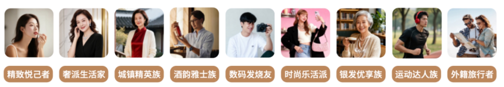 图源:《2024-2025中免消费白皮书》 从规模扩张到圈层精耕,打破大众客群模糊定位 伴随中国旅游零售市场向高质量发展转型,消费客群的结构性变化成为行业转型的核心信号,“广覆盖”的传统逻辑逐渐被“精准化”的圈层运营取代。中免集团基于消费贡献、品类偏好、年龄分层、地域分布等核心维度,将核心客群拆解为九大细分类别,每个圈层都带着清晰的需求标签,精准覆盖不同场景下的消费诉求,勾勒出旅游消费的多元图景:31-45岁一二线“精致悦己者”主打高端护肤;高净值“奢派生活家”偏爱腕表珠宝;三四线“城镇精英”务实追品质;31-50岁男性“酒韵雅士”热衷高端酒饮;21-35 岁“数码发烧友”聚焦科技产品;16-30岁Z世代“时尚乐活派”追彩妆潮流;60+“银发优享族”重健康消费;26-45 岁“运动达人”选专业装备;外籍旅行者青睐中国特色商品。