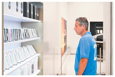 作为许多来华外国游客入境游“第一站”,上海见证了强劲的入境游消费活力。今年上半年,上海海关共验核离境退税申请单6.4万票,比去年同期大幅增长1.4倍,数量与去年全年总单数基本持平。图为近日,外国游客在位于上海市南京路步行街的华为商店里浏览电子产品。新华社记者 陈浩明摄