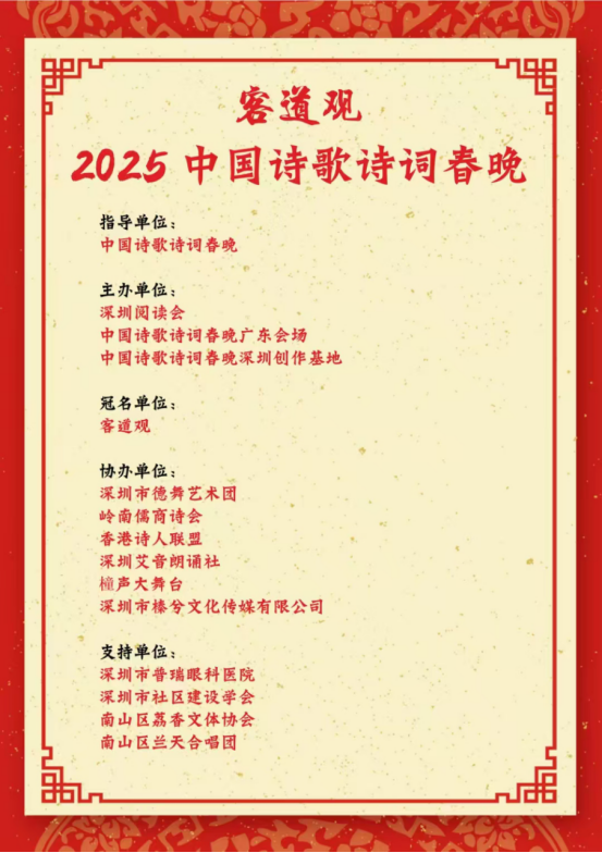 本次活动由中国诗歌诗词春晚指导,深圳阅读会、中国诗歌诗词春晚广东会场、中国诗歌诗词春晚深圳创作基地主办,客道观冠名,深圳市德舞艺术团、岭南儒商诗会、香港诗人联盟、深圳艾音朗诵社、橦声大舞台、深圳市榛兮文化传媒有限公司协办,深圳市普瑞眼科医院、深圳市社区建设学会、南山区荔香文体协会、南山区兰天合唱团支持。精彩节目轮番上演,令人应接不暇,共谱诗歌与艺术华章。 活动由王博生担任总顾问,戴梅担任总策划,古歌担任总监制,刘中赞担任总指导,钟晴担任总导演。在他们的精心筹备与组织下,活动得以顺利进行。活动最后,全体人员共同唱响《难忘今宵》,为这场诗歌与艺术的盛会画上圆满句号,温馨的歌声传递着对此次活动的不舍与对未来的美好期许。 “客道观”2025中国诗歌诗词春晚广东会场的成功举办,在辞旧迎新的美好氛围中,为鹏城深圳增添了一抹诗意的亮色。它不仅丰富了深圳市民的精神文化生活,也为诗歌艺术的传播与发展搭建了重要平台,推动了地方文化的繁荣与交流,如同一颗闪耀的文化火种,在深圳这片充满活力的土地上播撒下诗意的种子,期待来年绽放出更加绚烂的文化之花。 版权与免责声明: (1)凡带“中国文旅传媒”、“中国文旅传媒网”、“文旅传媒”、“文旅传媒网”的所有文字、图片、视频,版权均属中国文旅传媒网所有,未经本网书面授权,任何媒体、网站或个人不得转载或以其他方式使用,否则即为侵权。违者本网将依法追究其法律责任。 (2)经本网协议授权的媒体、网站,使用时必须保留原出处,如有媒体、网站或个人从本网下载、使用、转载稿件,必须注明稿件来源,并自负与版权有关的法律责任。同时,本网保留修改、更正、删节已供稿件的权利。 (3)本网转载内容仅为信息传递,并非商业用途,本网所转载文章内容,并不代表本网观点。 (4)本网转载文章如涉及作品内容、版权等相关问题,请在壹周内通过电子邮件与本网站联系,邮箱:962337398@qq.com 我们将在第一时间进行内容删除。https://cctmcn.com/sys-nd/5166.html